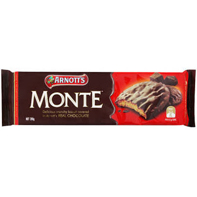 Arnott's Monte is a delicious crunchy biscuit covered in Arnott's Real Chocolate - Delicious crunchy biscuits covered in Arnott's Real Chocolate, made from the finest cocoa ingredients and natural milk products