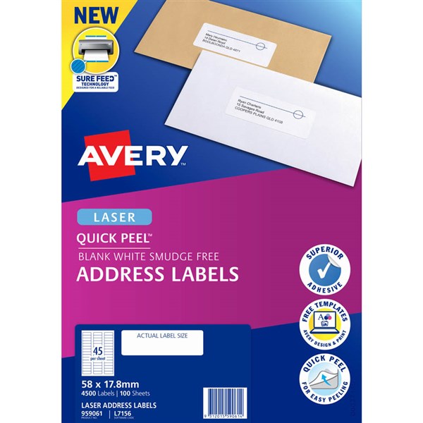 AVERY 959061 L7156 QUICK PEEL ADDRESS LABEL WITH SURE FEED LASER 45UP WHITE PACK 100