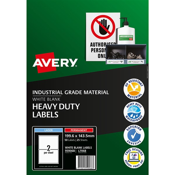 AVERY 959068 L7068 HEAVY DUTY LASER LABELS 2UP WHITE PACK 25