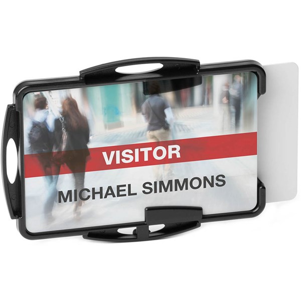 SPECIFICATIONS - Type: ID Card Holder - Material: Plastic - Orientation: Landscape / Portrait - Capacity: 2 cards - Inner Dimension: 54 x 87mm - Colour: Black - Pack of 10 - OEM: 898901
