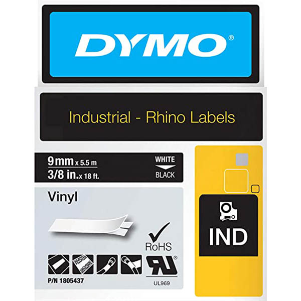 SPECIFICATIONS - Compatible with the following: DYMO Rhino Industrial, Dymo LabelManager, Dymo LabelWriter 450 Duo - Consumable Type: Vinyl tape - Label Type: Direct thermal printing - Self-Adhesive: Yes - Tape width: 9mm - Tape Length: 5.5mm - Tape colour: Black - Text colour: White - OEM: 1805437