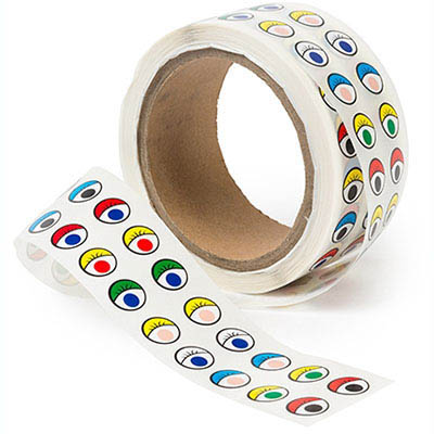 Roll of 2000 pairs of styled coloured eyes with 10 different colours and characteristics from sleepy to pop eye - Self adhesive backing for easier sticking