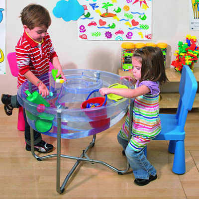 Circular sand and water tray is designed with multiple interior levels and slopes to allow children to explore many different activities - Constructed of strong durable plastic, with a heavy duty steel tubular frame