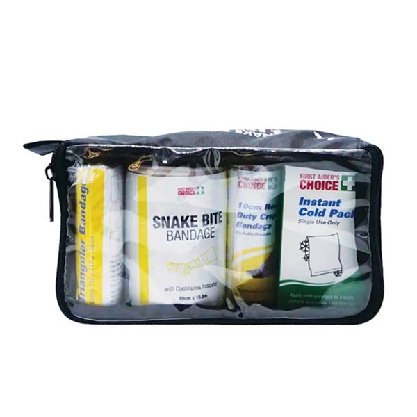 - Kit Contents: 1 antiseptic cream 1g, 1 bandage crepe heavy support 10cm x 2m, 1 bandage snake bite indicator 10.5m stretched, 1 bandage triangular 110cm x 110cm x 155cm, 1 CPR chart, 1 instant cold pack, 1 snake bite treatment instruction card, and 1 spider bite treatment instruction card