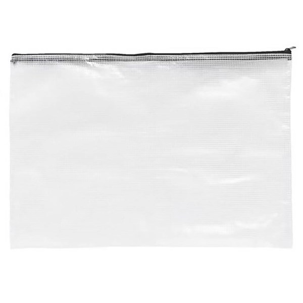 Made from strong water-resistant, clear, flexible plastic material, with a reinforced fabric mesh and coloured sturdy fabric zipper closure - This practical case is ideal as a data, storage, stationery and file bag