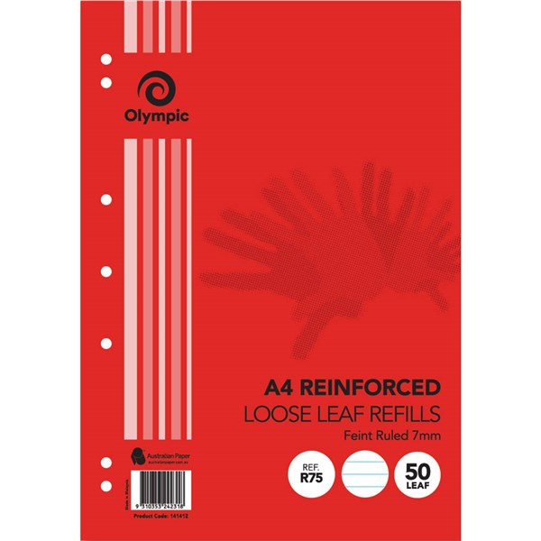 OLYMPIC R75 REINFORCED LOOSE LEAF REFILL 7MM FEINT RULED 55GSM A4 PACK 50