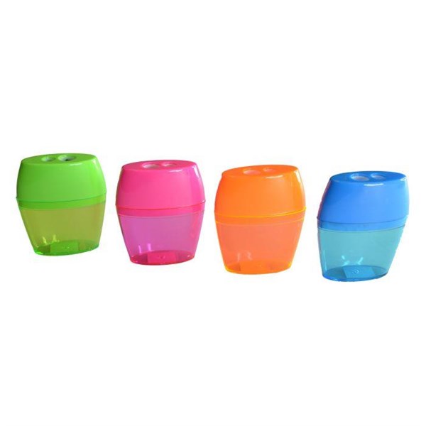 SPECIFICATIONS - Type: Pencil sharpener - Material: Plastic - Canister: Yes - Holes: 2 - Size: 60(w) x 20(d) x 70(h)mm - Colour: Assorted - Please Note: Colour picked at random at point of sale