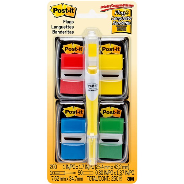 SPECIFICATIONS - Type: Flag - Plus Bonus - Dispenser: Yes - Pads per pack: 4 - Sheets per pad: 50 - Total Sheets: 200 - Size: 25 x 43mm - Colour: Red, Yellow, Green, Purple - Bonus: Post-it Flag and Gel Pen 0.5mm Black - Pack Ref: 680-RYBGVA - OEM: 70005183945