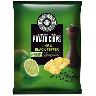 Red Rock Deli Potato Chips Lime and Black Pepper flavoured potato chips are seasoned with freshly ground peppercorns and the tangy zing of fresh limes with - Our fascination for flavour begins with the finest Australian potatoes. Roughly cut and slow-cooked in 100% Sunflower Oil, they're then seasoned with delicious ingredients using inspiring recipes prepared by passionate foodies, for a truly unique taste sensation