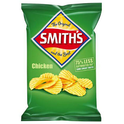 Smith's Crinkle Cut Chicken Potato Chips - There is no better snack when watching the footy grand final, having a picnic or indulging after work - Our top quality Aussie potatoes are peeled and sliced to just the right crinkle cut thickness and cooked to perfection then sprinkled with our famous seasoning so you can enjoy the classic crunch and unbeatable Chicken flavour that only a Smith's potato chip can bring!