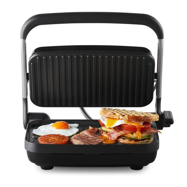 - * Patented AnyHeight Control Lever allows for multiple height adjustment and versatile top plate-lock * Fits 2 Sandwiches - create evenly browned toasties with beautifully melted cheese without any squishing or flattening * Fast and Even Cooking - get heat-up and even heat distribution in just 2 mins * Start cooking steaks from 3 mins of switching the power on * Easy to Clean - non-stick coating and curved corners of the cooking plates make wiping up oil and crumbs effortless * Space-Saving Storage - conveniently folds up for stand-up storage * Built-in cord wrap hidden at the base