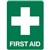 Indicate the location of, or directions to emergency related facilities - Contains a white symbol and text on a green background