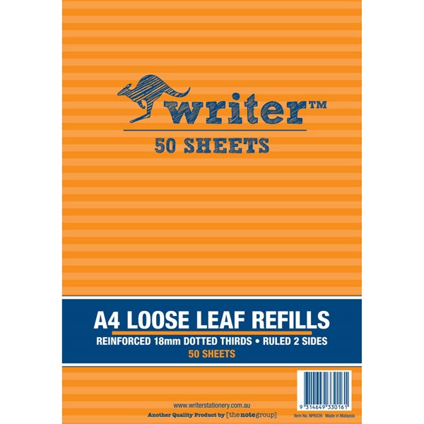 WRITER LOOSE LEAF REFILL REINFORCED 18MM DOTTED THIRDS 60GSM A4 50 SHEET