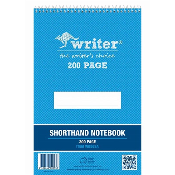 The Writer shorthand spiral note book is a quality reporter size notebook featuring a cardboard cover, 60gsm paper with blue ruled lines x 2 sides and a strong backboard - Top bound, single spiral binding allows for the book to open flat for easy note taking