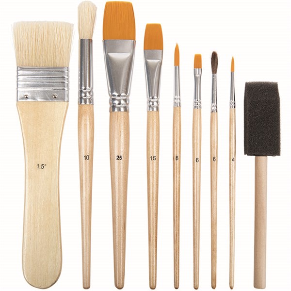 This set includes a Foam Brush 25mm, Wide Bristle Brush (32.5mm), Round Synthetic Taklon Brushes (#4 and #10), Flat Synthetic Taklon Brushes (6mm, 15mm and 25mm), Fine Hair Watercolour Brush Round (#6), and Hog Hair Bristle Brush Round (#10) - Pack of 9 brushes