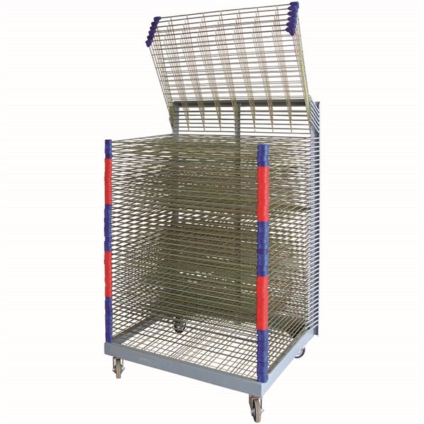 This spring loaded drying rack has 50 shelves that are large enough to hold an A1 sized sheet - It is sturdy and made from galvanised iron which makes it waterproof and easy to clean