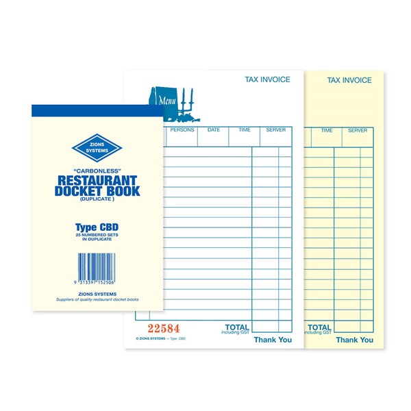 Zions carbonless restaurant and cafe docket book - Zions offers a wide range of single, duplicate, triplicate and quadruplicate restaurant docket books, suitable for all styles of bistros, cafes, restaurants and take-away outlets
