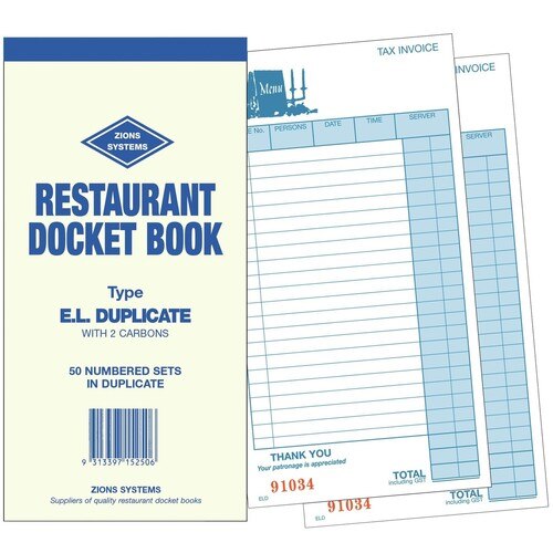Zions Restaurant and cafe docket book - Zions offers a wide range of single, duplicate, triplicate and quadruplicate restaurant docket books, suitable for all styles of bistros, cafes, restaurants and take-away outlets
